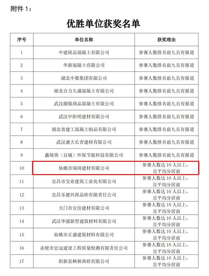 近日,根據(jù)湖北省預拌混凝土協(xié)會《關(guān)于公布“善諾律所杯”湖北省預拌混凝土(砂漿)企業(yè)質(zhì)量管理知識競賽比賽結(jié)果的通知》,仙桃市瑞琦建材有限公司以優(yōu)異成績榮獲優(yōu)勝單位;黃果輝、嚴俊、付習文榮獲優(yōu)秀個人一等獎,許智勇、李弦榮獲優(yōu)秀個人二等獎。...